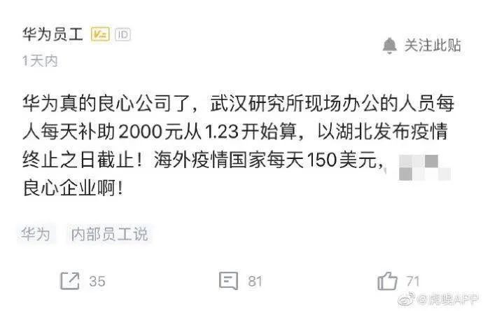 近日有华为员工发帖称,武汉研究所现场办公的人员每人补助2000元(从1月23日开始算,以湖北发布疫情终止之日截止),湖北以外其他地区1000元,海外每天150美元。