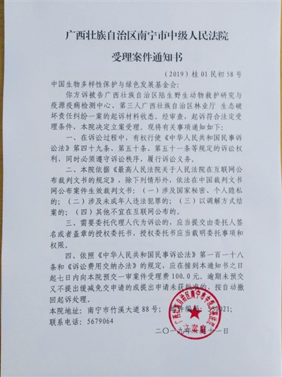 2018年9月14日,绿发会将广西壮族自治区陆生野生动物救护中心作为被告,并追加广西壮族自治区林业局为第三人一并提起诉讼。经过三次补充提交起诉状,2019年1月11日,绿发会收到了南宁市中级人民法院寄来的受理通知书。
