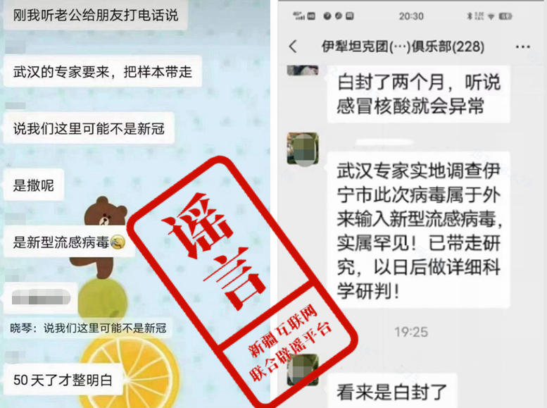 据新疆网络辟谣消息,接网民举报,近日有网民在微信群圈、微博、抖音等平台以短视频、图片或文字等形式散布“武汉专家实地调查伊宁市此次病毒属于外来输入新型流感病毒”等虚假信息及类似变种样本。经与有关部门核实查证,上述信息为网络谣言。