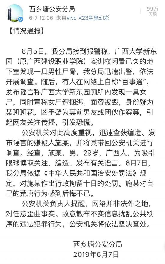 随后,有人在网络上自称“百事通”,发布谣言称广西大学新东园厕所内发现一具女尸,同时宣称女尸遭捆绑、面容被毁,身份疑为某班班花,凶手疑为其前男友或团伙作案等,引起网友关注传播,引发恐慌。
