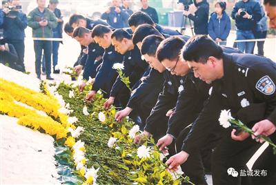 7时30分,在事故现场附近的响水生态化工园区管委会院内,事故善后处置指挥部的工作人员、盐城市和响水县有关负责人、现场参与救援和清理工作的消防指战员和武警官兵以及部分遇难者家属代表,胸戴白花,手持白菊,列队默哀一分钟,并向遇难者鞠躬、敬献鲜花。