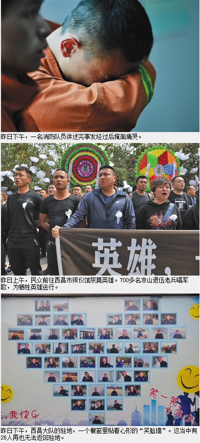 昨日上午,西昌市殡仪馆外,700多名凉山退伍老兵唱起军歌,为遇难扑火队员送行。