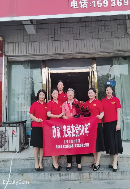 7月4日,为庆祝中国共产党成立100周年,继承和发扬党的光荣传统,进一步增强公益组织凝聚力,周口爱心粥屋公益组织响应团市委号召,组织志愿者看望慰问光荣在党50年以上的老党员彭君和李巧莲,向他们致以崇高的敬意。