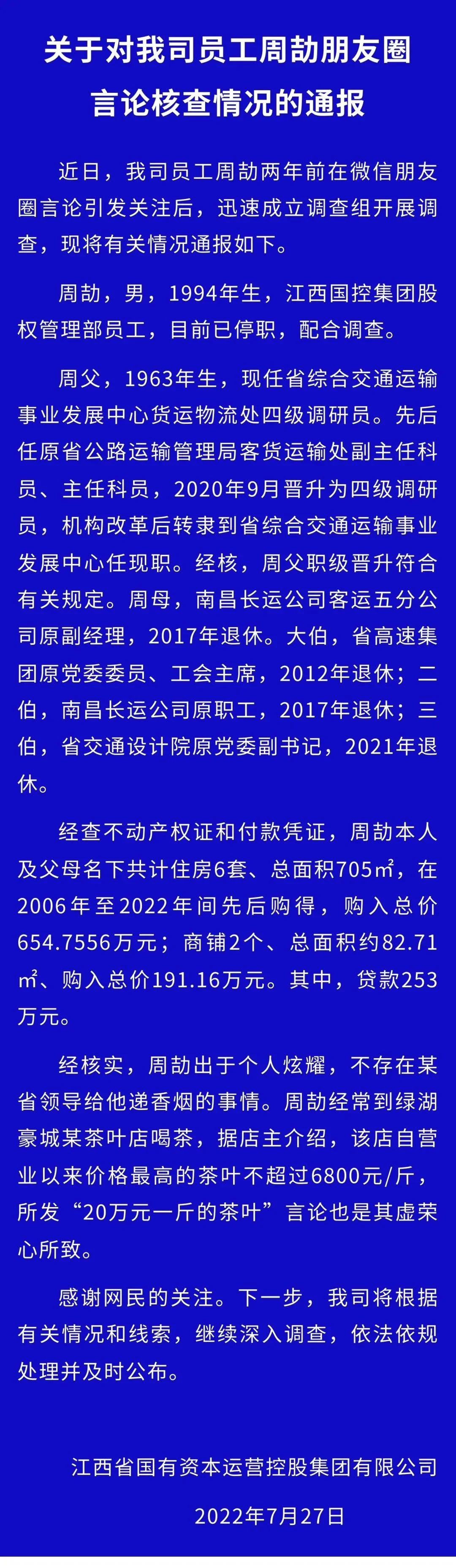 7月25日,江西国控集团发布情况通报:近日,我司员工周劼在本人微信朋友圈发表的不当言论引发关注。我司高度重视,第一时间成立了由纪委牵头的调查组进行核查处置。现将初步核查情况通报如下: