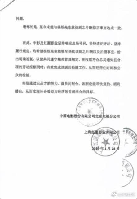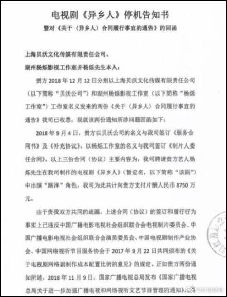 而在4月17日,网上曝光的两封疑似电视剧《异乡人》(《漂洋过海来看你之异乡人》)发给演员杨烁的公告中,显示杨烁在限薪令颁布后,仍拒绝按规定降低片酬,致使该片一度被迫停机。