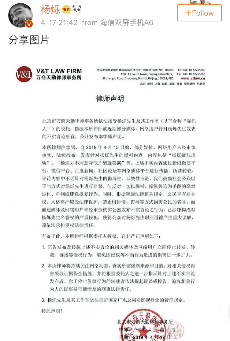4月17日,针对网友爆料的“杨烁方不同意降低片酬就罢演”及“杨烁疑似出轨”等传闻,杨烁方委托律师发布声明,称以上均属不实传闻,已涉嫌侵犯对杨烁名誉权,请立即停止转发、转载等行为,也将对不实言论的发布者依法追责。同时,杨烁及其工作室坚决拥护国家广电总局对影视行业的管理规定。