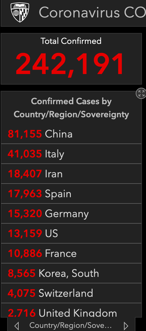 根据美国约翰斯·霍普金斯大学发布的全球实时疫情数据,截至北京时间20日早上7时,除中国之外,全球范围内已有6个国家累计新冠肺炎超过1万例。其中,意大利41035例,伊朗18407例,西班牙17963例,德国15320例,美国13159例,法国10886例。