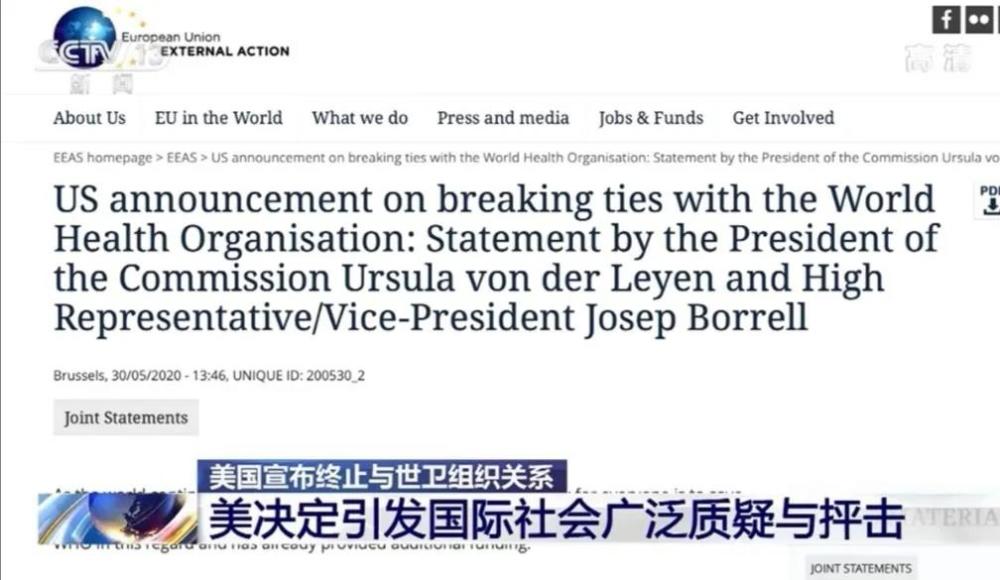 在新冠肺炎疫情全球大流行的关键时刻,美国政府一意孤行地终止与世卫组织的关系,遭到国际社会和美国国内各界的广泛批评。