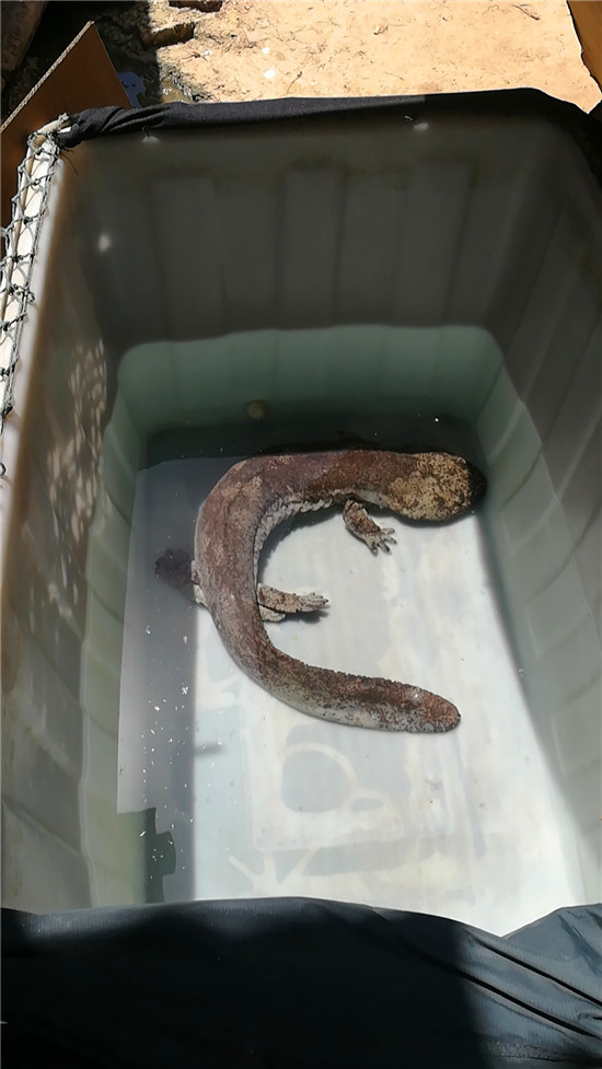 郭东俊查询得知娃娃鱼对水质要求比较高,立即去超市买了一个新的塑料整理箱和两件纯净水,给娃娃鱼整了一个临时的家,还特别用纸箱给它遮阴,像照顾孩子一样小心翼翼。“娃娃鱼是国家二级保护动物,咱一定得保护好它。”郭东俊说,由于自己文化程度不高,他一直不知道该联系哪个部门,他希望尽快联系到有关部门,给娃娃鱼找一个美好的家。