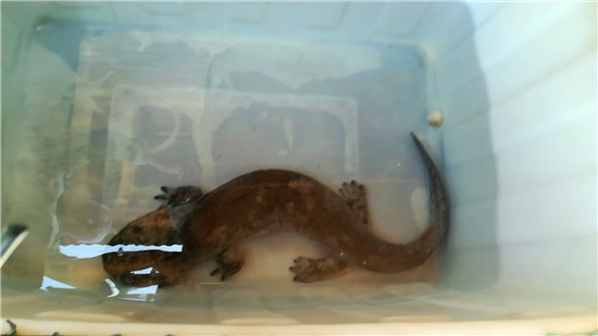 郭东俊用纯净水和新塑料箱给娃娃鱼建了一个临时的家