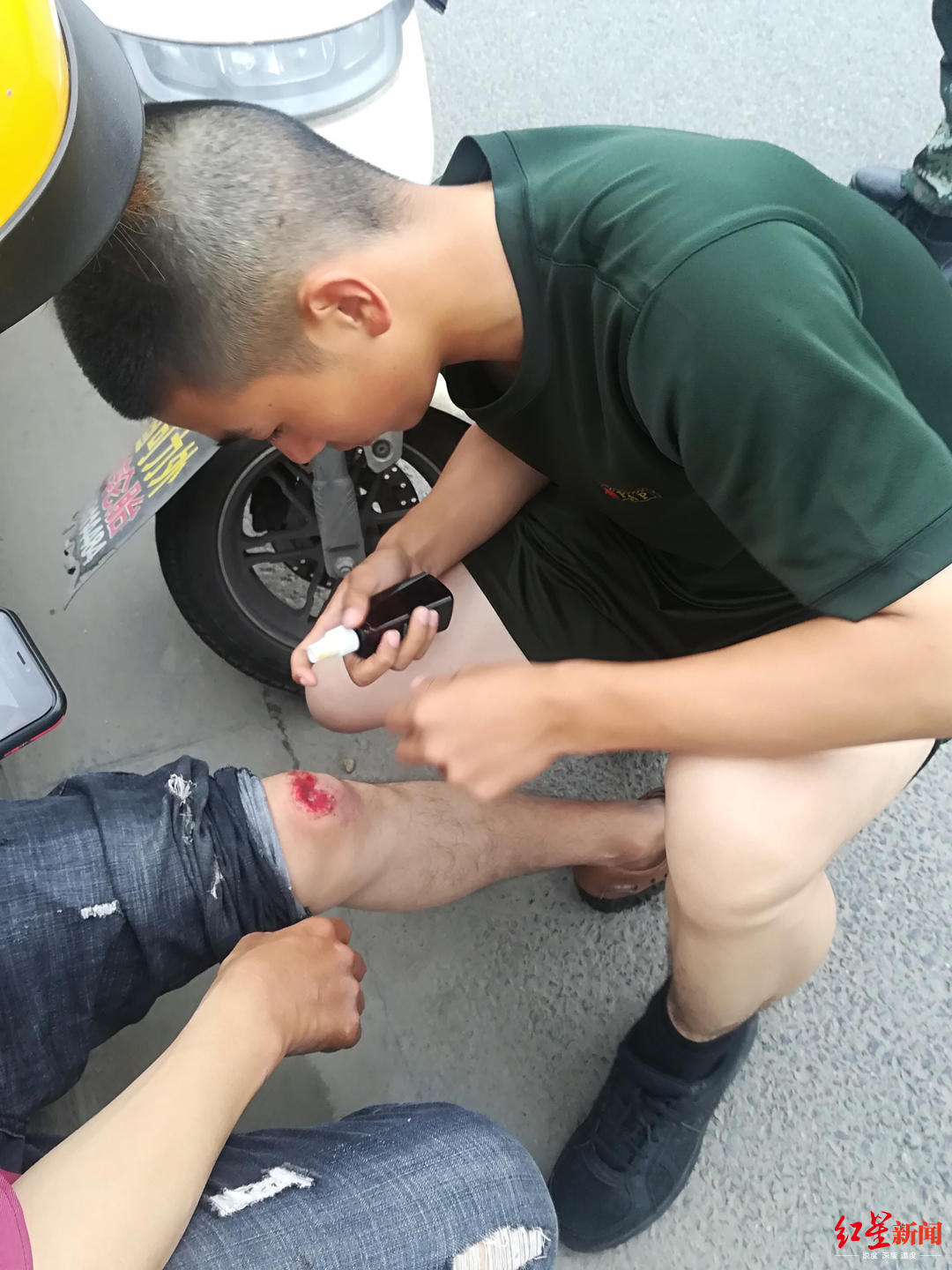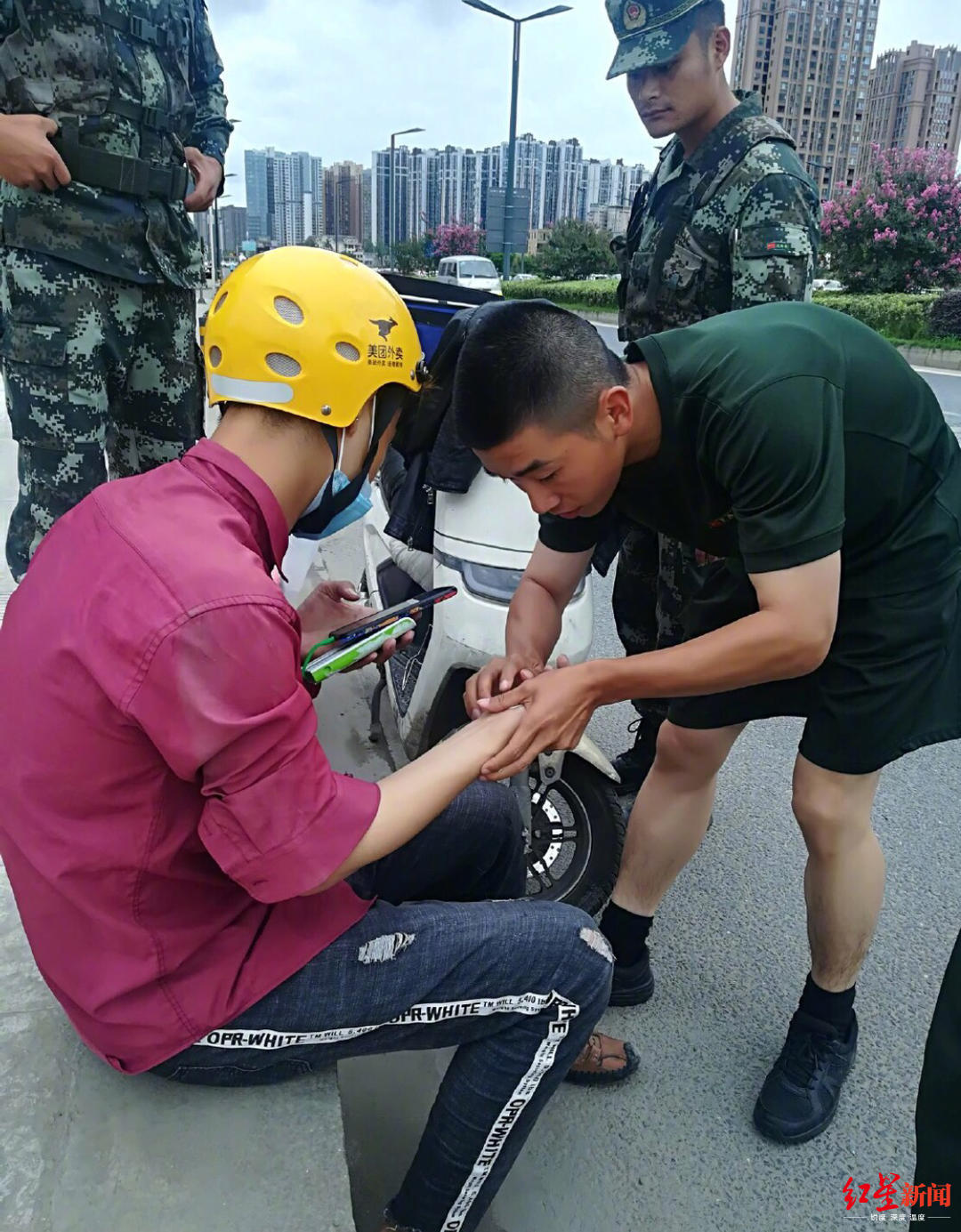 7月11日傍晚,在成都剑南大道武警警官学院附近,一位外卖小哥骑电动车时不慎摔倒,造成身上多处擦伤。周围路人赶忙将外卖小哥扶到路边安全处,随后有人向武警寻求帮助,几名武警小哥哥立即赶来,现场帮外卖小哥处理伤口。