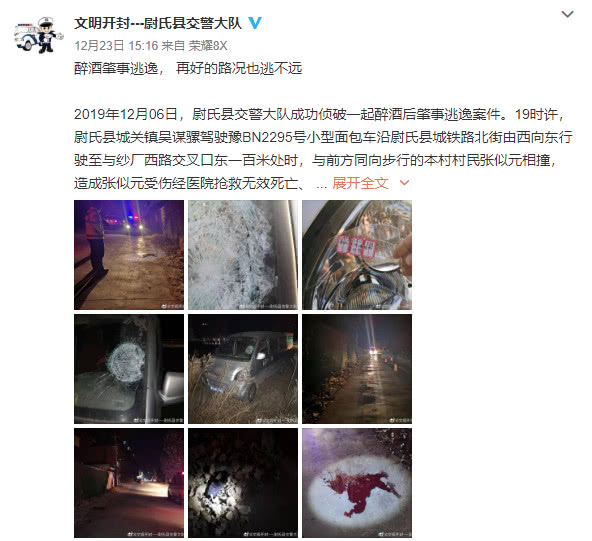 2019年12月06日,尉氏县交警大队成功侦破一起醉酒后肇事逃逸案件。19时许,尉氏县城关镇吴谋骡驾驶豫BN2295号小型面包车沿尉氏县城铁路北街由西向东行驶至与纱厂西路交叉口东一百米处时,与前方同向步行的本村村民张似元相撞,造成张似元受伤经医院抢救无效死亡、豫BN2295号小型面包车损坏的交通事故,事故发生后吴谋骡驾车逃逸。