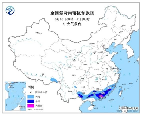 预计,6月10日08时至11日08时,福建中南部、湖南东南部、广西中部、广东大部等地有大到暴雨,其中,福建南部、广东中部等地的部分地区有大暴雨(100~150毫米),局地伴有雷暴大风等强对流天气,最大小时降水量30~50毫米,局地可达60毫米以上。