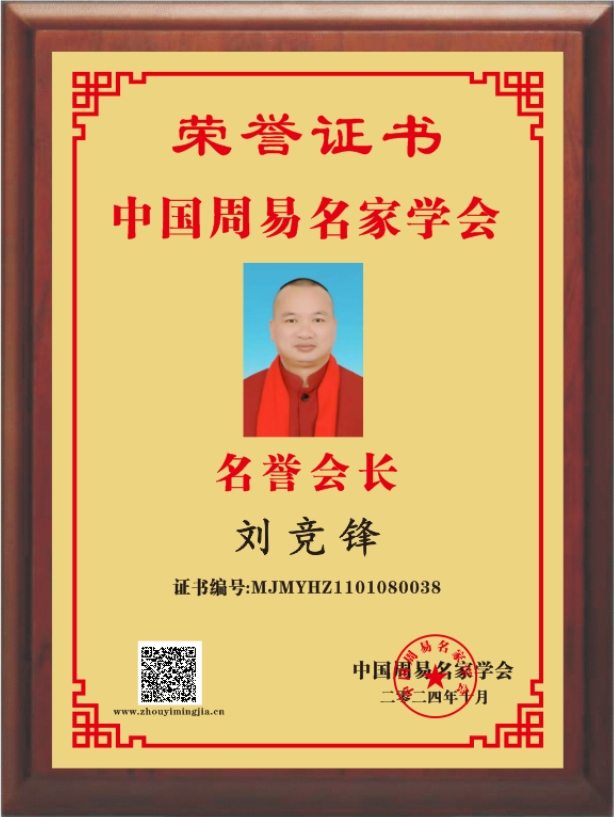 2008年刘竞锋大师被全球易经文化协会、中国山西省闻喜县人民政府、全球风水协会、中国易经协会、首届全球易学风水名师组委会联合授予“全球易学风水名师”荣誉称号,并在全球易经文化协会、中国易经协会、山西省闻喜县人民政府官方网站长期公布宣传,“全球易学风水名师”资格证书编号:200804210002。2014年刘竞锋大师在全球华人易学名家千人邀请赛上一举夺得“中国当代杰出择日名师”殊荣。