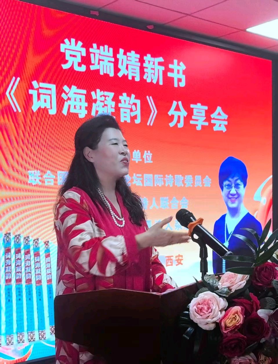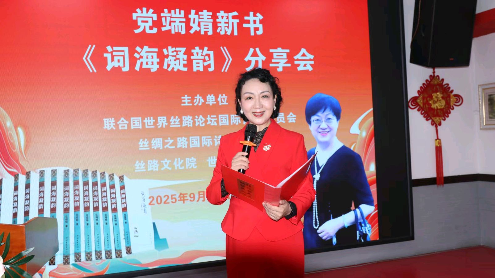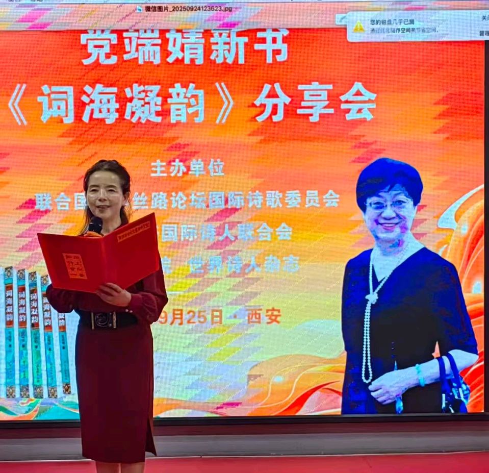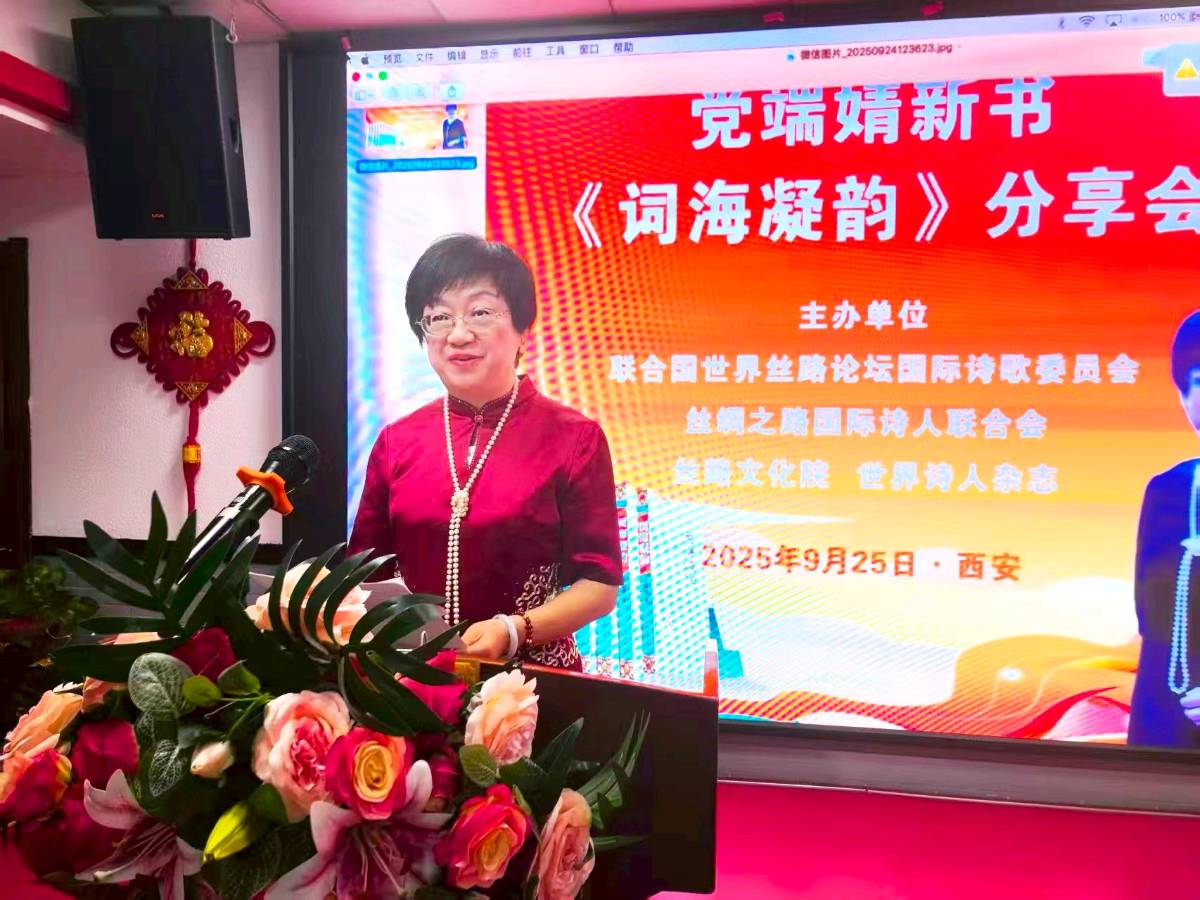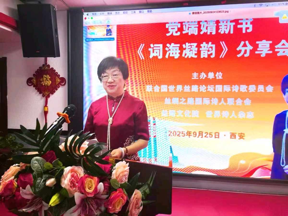 9月25日,秋高气爽,丹桂飘香。由丝绸之路国际诗人联合会、丝路文化院联合举办的中国诗歌学会会员、陕西汉唐诗社社长党端婧《词海凝韵》新书发布暨分享会在古城西安大雁塔隆重举行。