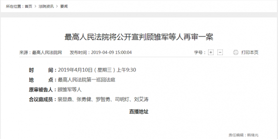 据最高法院官网消息,最高法院将于4月10日上午9点半公开宣判顾雏军案。原审被告人为顾雏军等人,合议庭成员为五人,裴显鼎、张勇健、罗智勇、司明灯、刘艾涛。