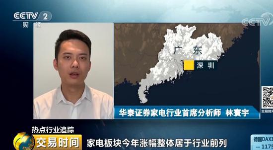 华泰证券家电行业首席分析师 林寰宇:家电板块,今年涨幅整体居行业前列,由年初的估值补涨行情,再到外资进入,再到近期因为房地产复苏后,整个房地产产业链的估值修复,甚至行业性的一个上升,所以说从目前来看,家电板块的估值,恢复到历史中位数水平偏下的一个水平。