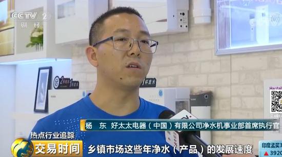 好太太电器(中国)有限公司净水机事业部首席执行官 杨东:乡镇市场这些年的净水产品的发展速度是比较迅猛的,大概平均都会在30%以上的增长速度。