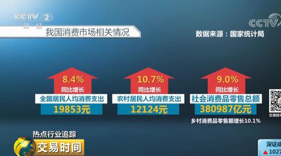 国家统计局公布的经济数据显示,2018年全年全国居民人均消费支出19853元,比上年增长8.4%;2018年农村居民人均消费支出达到12124元,比上年增长10.7%。2018年社会消费品零售总额达到380987亿元,比上年增长9.0%,其中乡村消费品零售额增长10.1%。