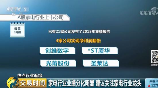 WIND数据显示,在A股中信分类家电指数中,54家家电上市公司发布了2018年业绩预告,其中32家公司业绩预喜,22家公司业绩预亏,业绩分化明显。截至3月底,已有21家家电上市公司发布了2018年报,其中创维数字、*ST厦华、光莆股份、圣莱达实现了同比净利润翻倍。