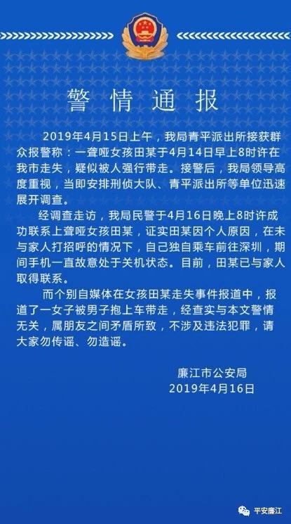 4月17日凌晨,廉江市公安局发布通报称,4月15日上午,该局青平派出所接获群众报警称:一聋哑女孩田某于4月14日早上8时许在我市走失,疑似被人强行带走。接警后,该局领导高度重视,当即安排刑侦大队、青平派出所等单位迅速展开调查。